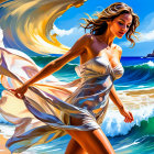 A woman in a flowing, colorful dress runs along a beach, her hair billowing in the wind. Waves crash behind her, and a picturesque island is visible in the distance under a bright sky.
