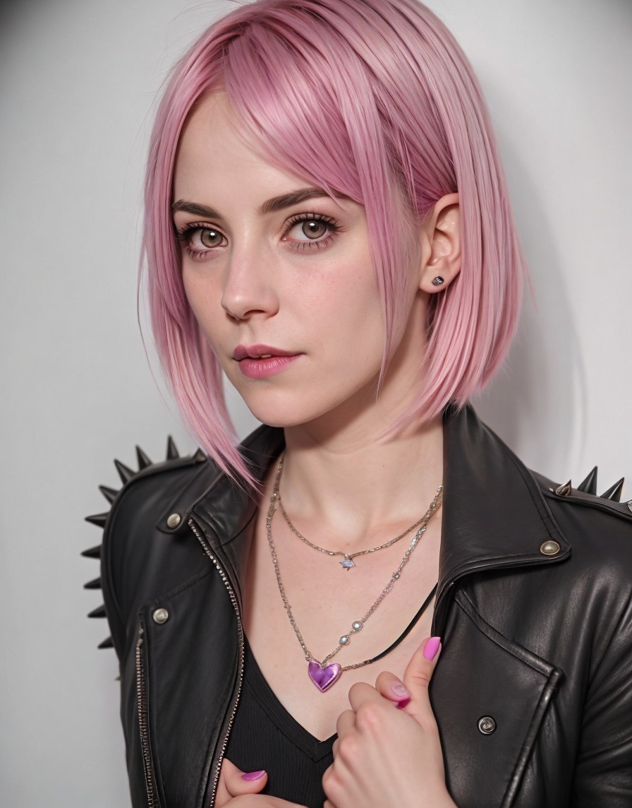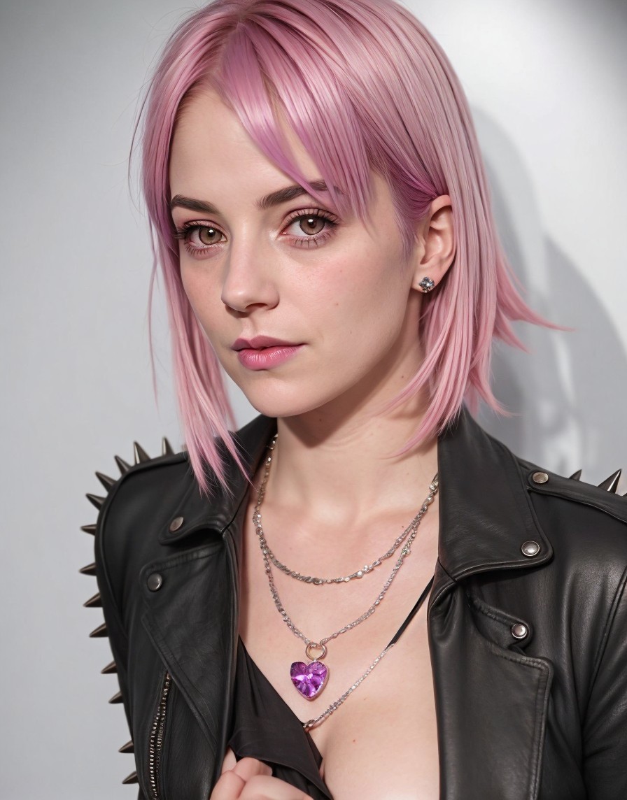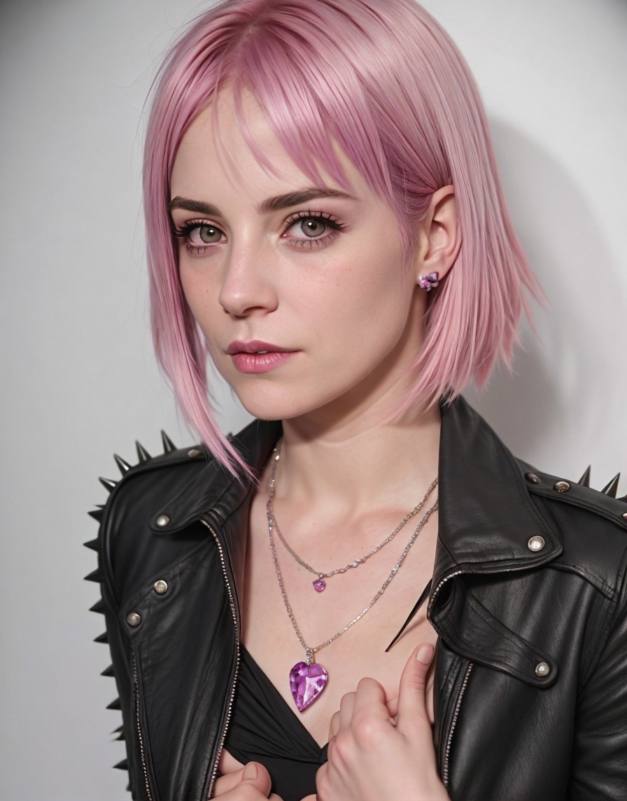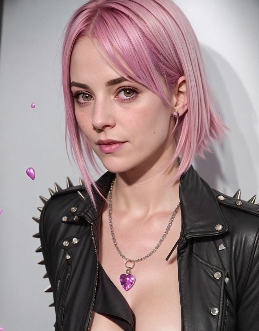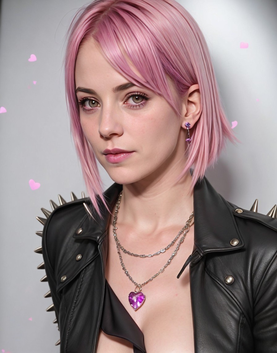 + Prompt:Tonks was a young witch with a pale heart-shaped face and dark twinkling eyes. She typically kept her hair short and spiky, and often bubblegum-pink.