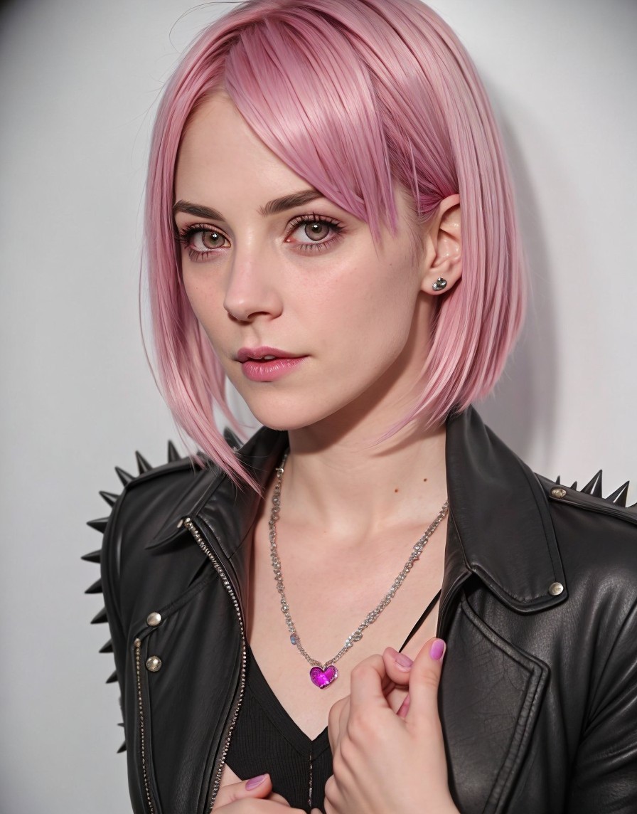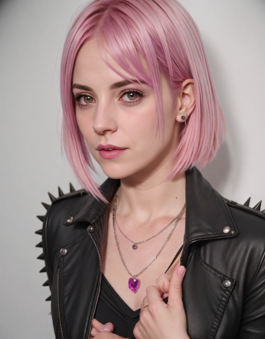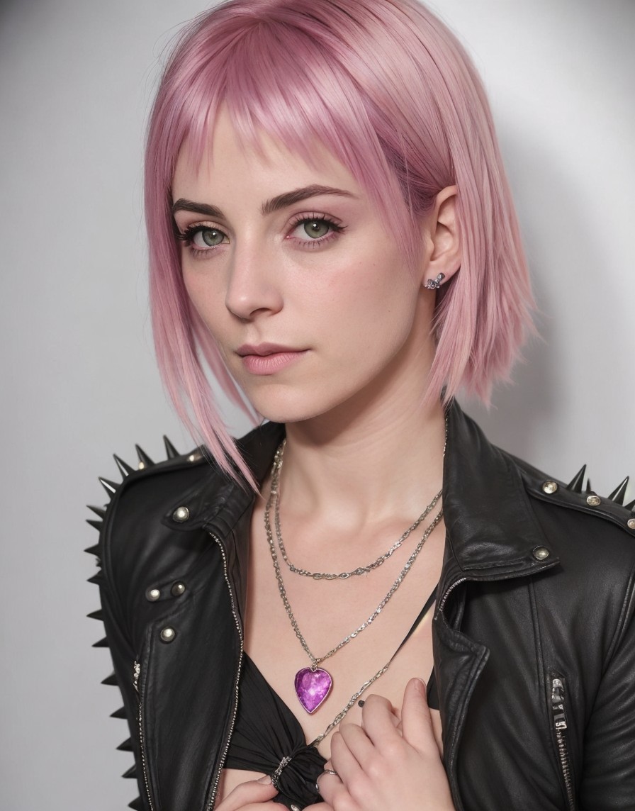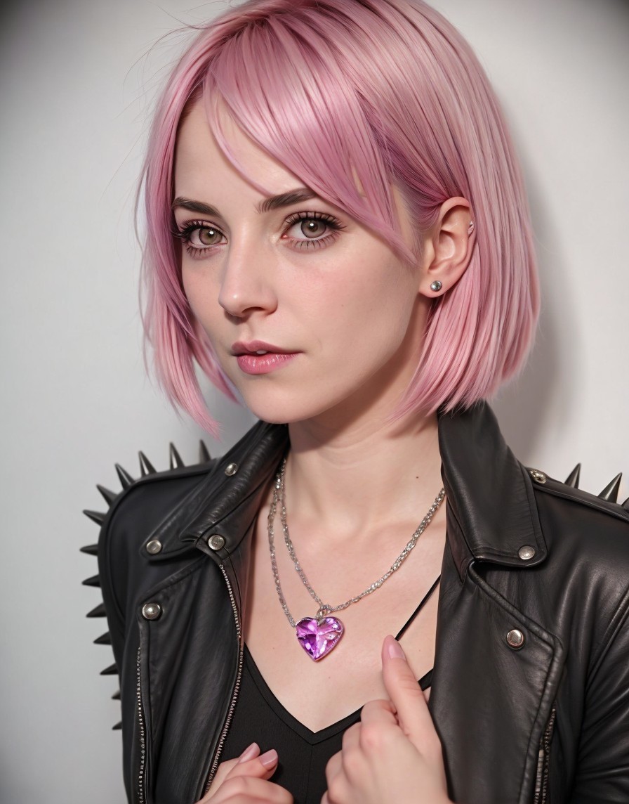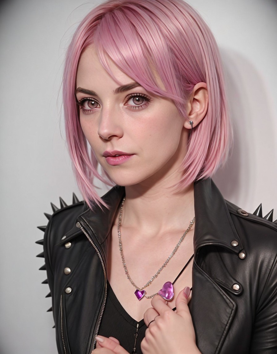 + Prompt:Tonks was a young witch with a pale heart-shaped face and dark twinkling eyes. She typically kept her hair short and spiky, and often bubblegum-pink.