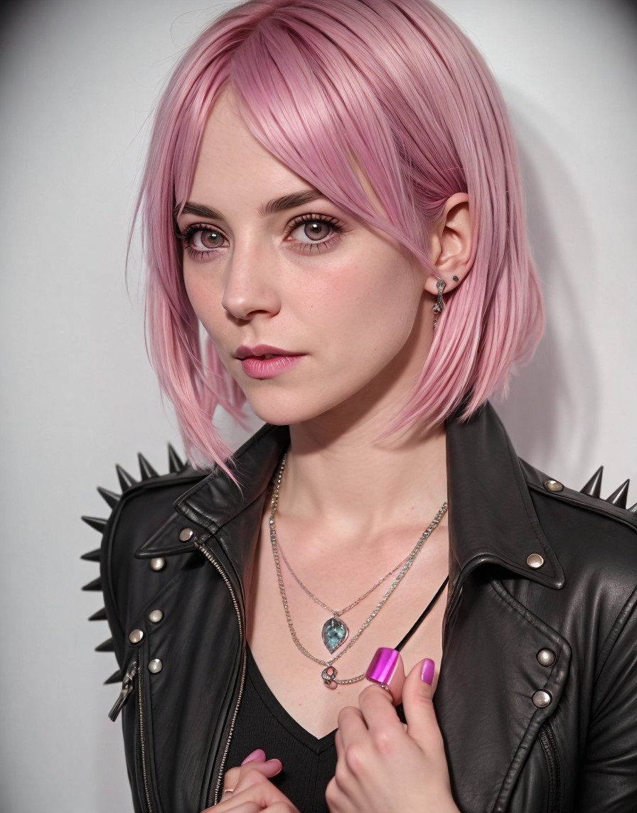 Prompt: Tonks was a young witch with a pale heart-shaped face and dark twinkling eyes. She typically kept her hair short and spiky, and often bubblegum-pink.