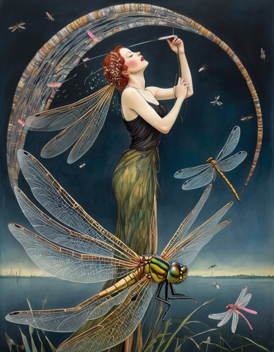 A stylized painting of a woman with dragonfly wings holds a needle, with giant dragonflies and water lilies in the background.