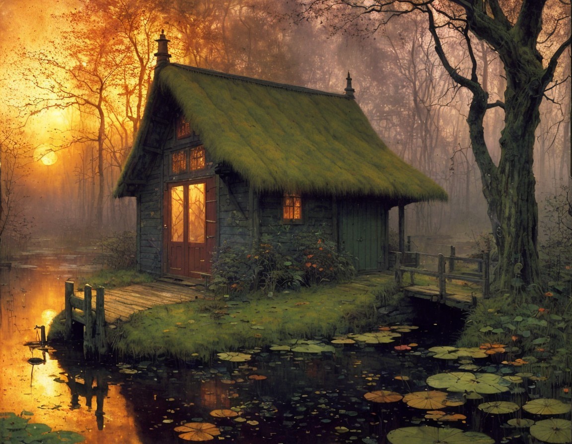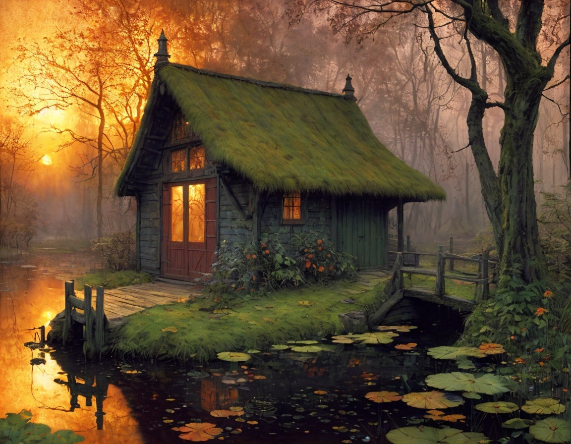 A cozy thatched cottage by a serene pond at sunset, surrounded by trees and floating lilies, emanating a warm, inviting glow.