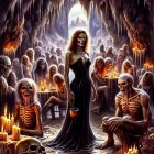 A mysterious figure in a dark, flowing dress stands confidently in a dimly lit underground chamber surrounded by glowing skeletons and flickering candles, creating an eerie atmosphere.