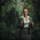 red hair in pulled up in severe vertical updo, open collar white satin blouse, buttoned up grey wool business suit, gray skirt, tropical prehistoric jungle, green canopy, no sky, beautiful mature face, big gaunt cheekbones, tiny mouth, thin red lips, action pose, surprised expression, big gorgeous blue eyes, wireframe glasses, mature Irish Fashion model age 65, slightly full-figured, King Kong approaching, Film Noir