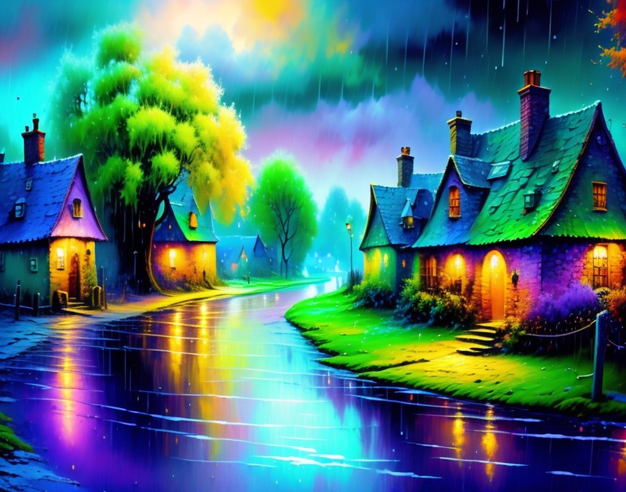 A picturesque rural landscape with a white house, vibrant trees, a grassy bank, and a calm river under a stormy sky.