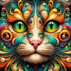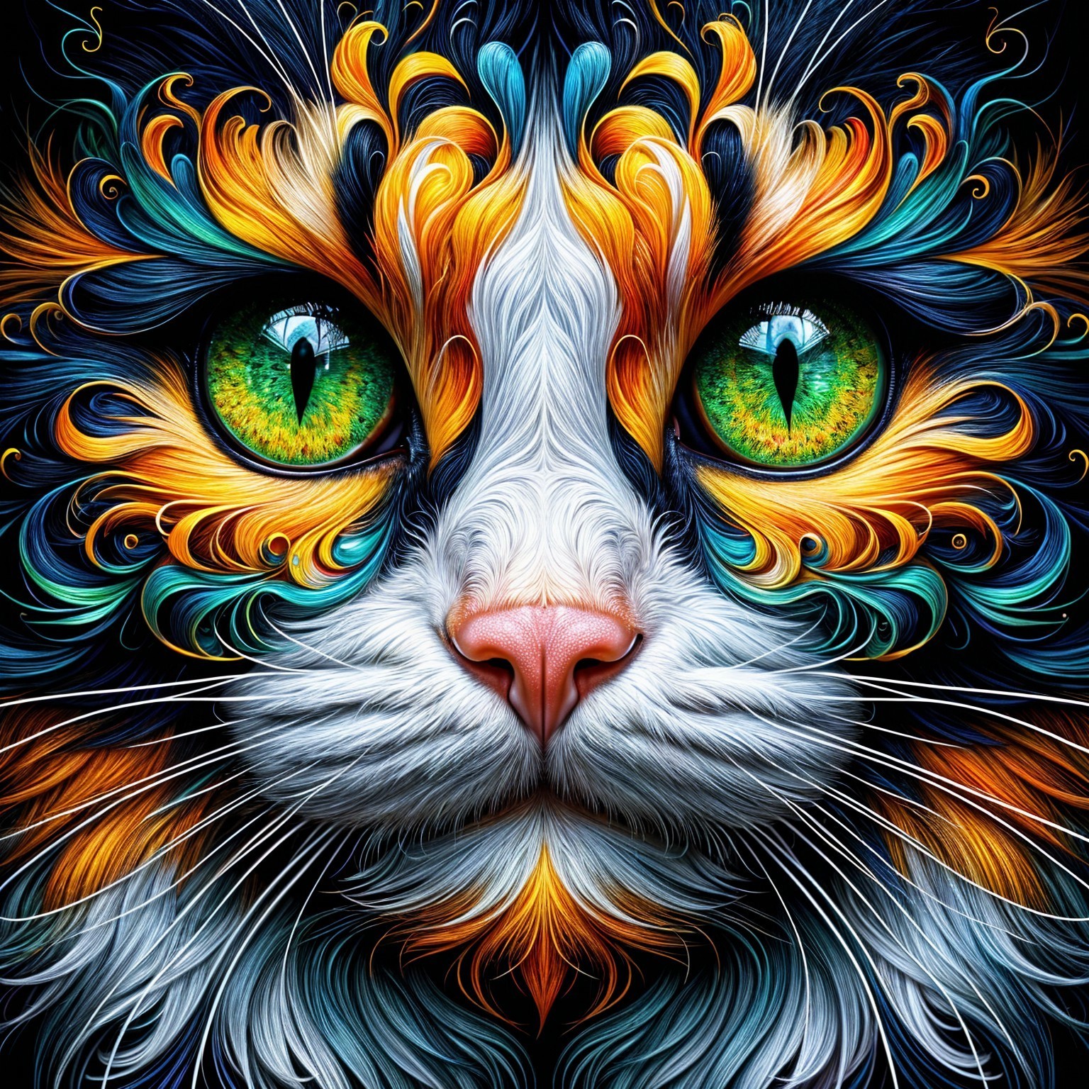 Close-Up of a Colorful Cat's Face with Green Eyes