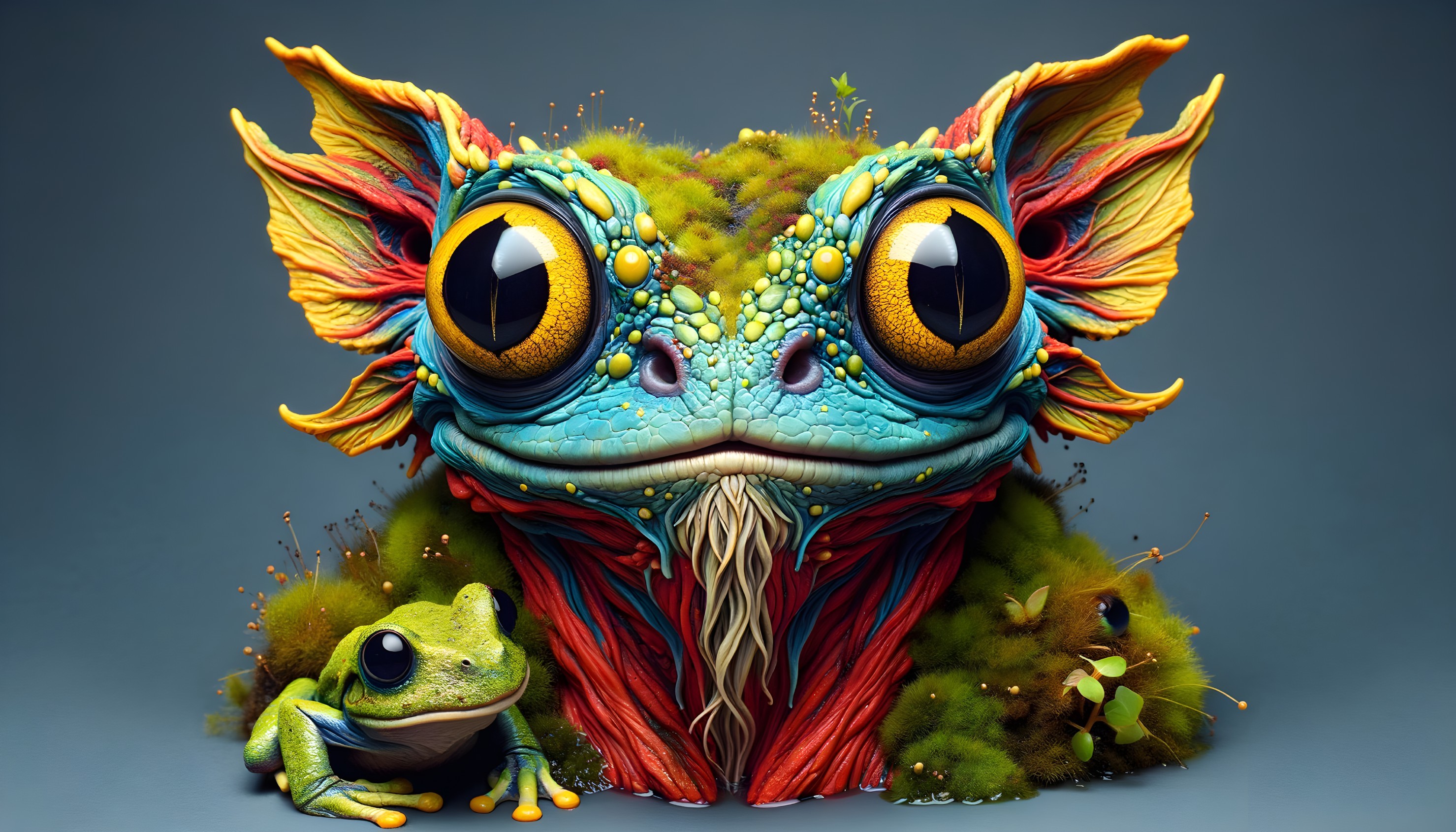 A colorful, whimsical illustration of a large-eyed, fantastical creature resembling a frog with vibrant foliage and a smaller frog beside it.