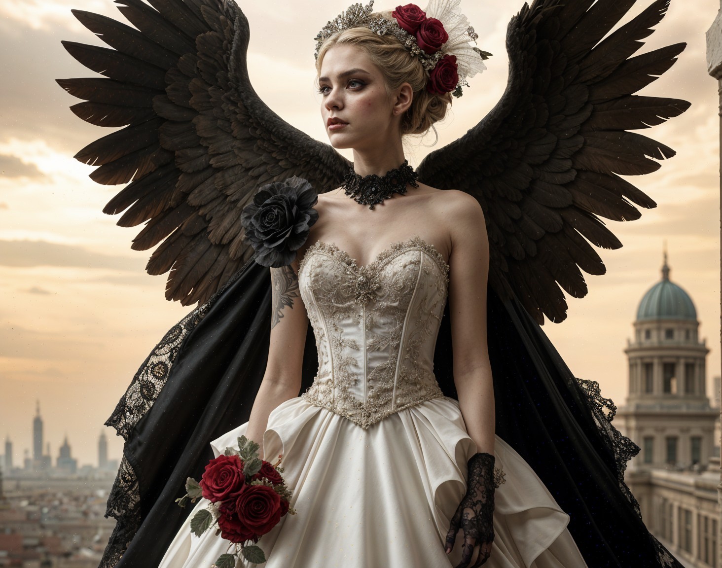 The AI had this to say about our work: "A striking figure in a dramatic gown with intricate lace details, adorned with roses. Majestic wings extend from her back, set against a city skyline, evoking a blend of elegance and mystery."