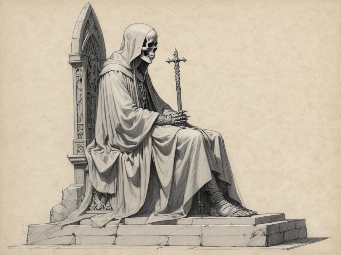 The image features a skeletal figure seated on a throne, draped in a flowing robe. It holds a cross staff, with a skull beside it, evoking themes of death and permanence.