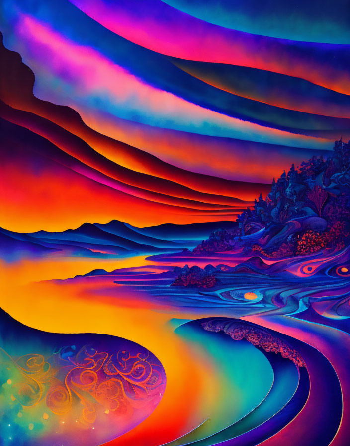 Colorful Psychedelic Landscape with Stylized Tree and Sunset Sky