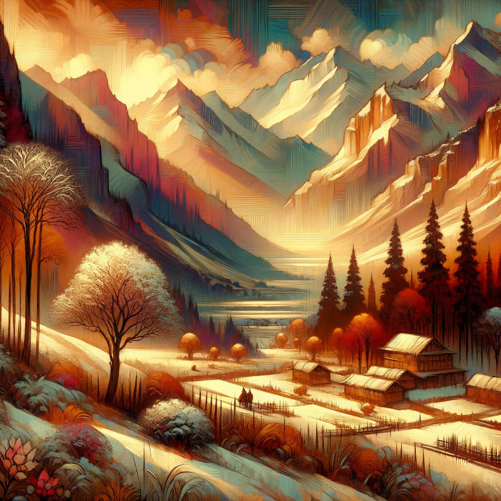 A breathtaking mountain landscape features towering, snow-capped peaks, reddish rocky formations, and traditional buildings nestled in a serene valley, illuminated by warm sunset hues.