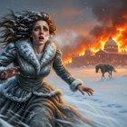 A terrified woman in a flowing coat runs through a snowy landscape, her hair whipping in the wind. Behind her, a grand building is engulfed in flames, with a horse standing nearby.
