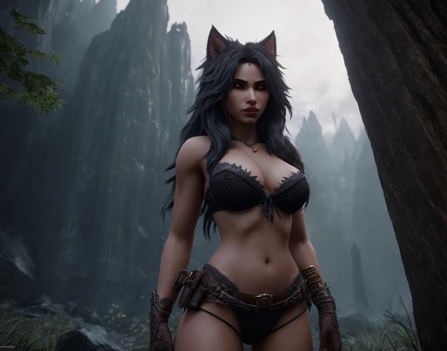 Fantasy digital artwork of woman with wolf-like ears in armor by misty gothic castle