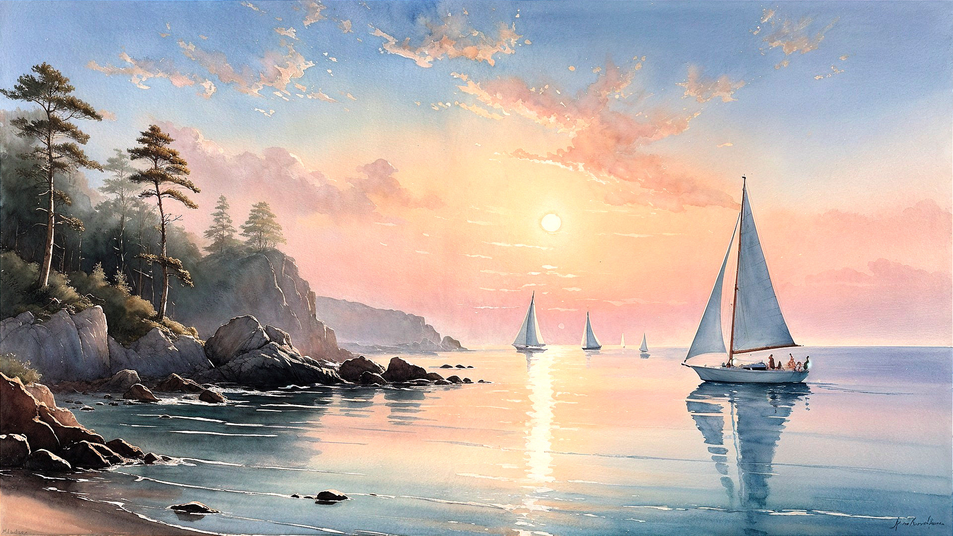 A serene coastal scene at sunset, featuring sailboats gliding across calm waters. Lush trees line the shore, and the sky is painted in soft hues of pink and orange, reflecting tranquility.