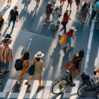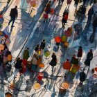 A busy urban scene from above, featuring a diverse crowd of pedestrians walking across a sunlit area, casting long shadows on the ground, creating a dynamic and lively atmosphere.