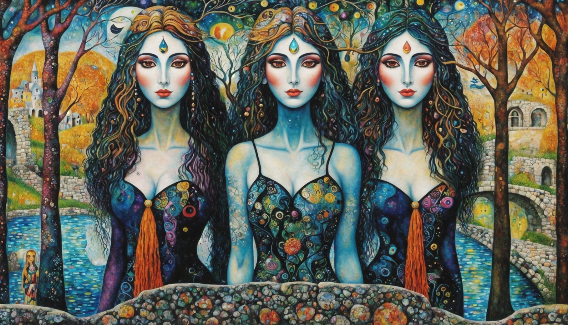 Three ethereal women stand side by side against a vibrant landscape. Their enchanting features and intricate attire blend harmoniously with the colorful, whimsical background of trees and water.