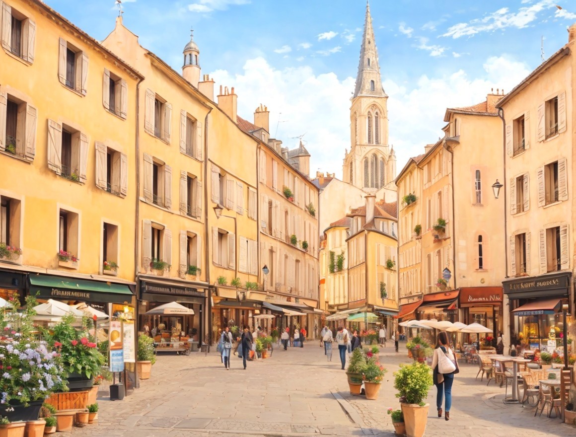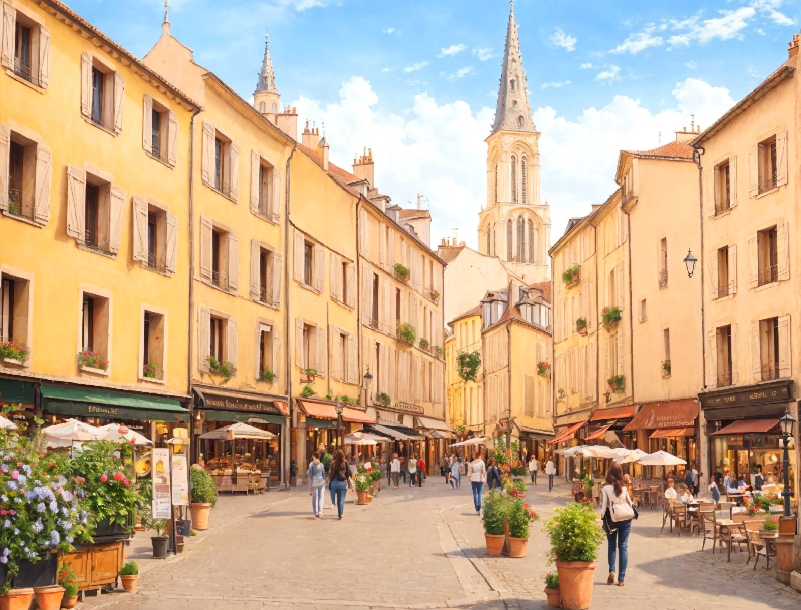 Vibrant European street with yellow buildings and cafes