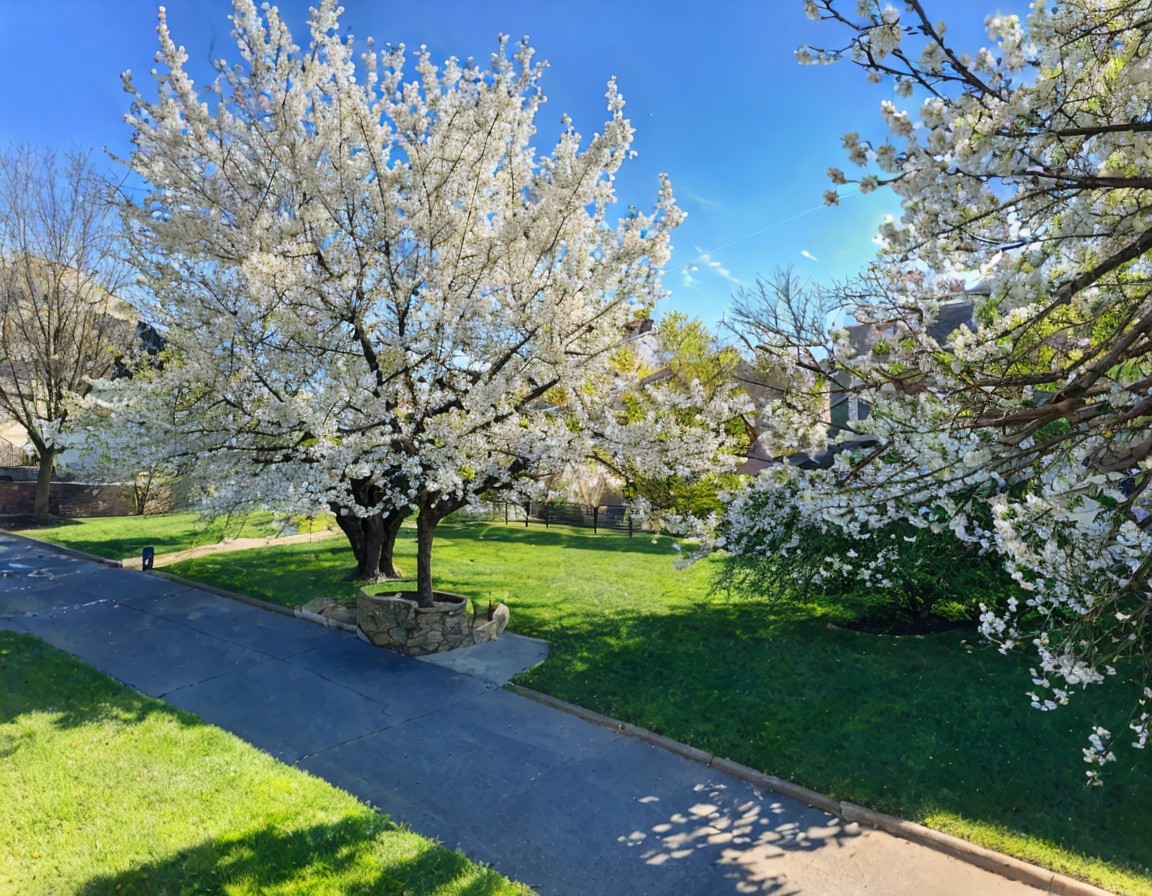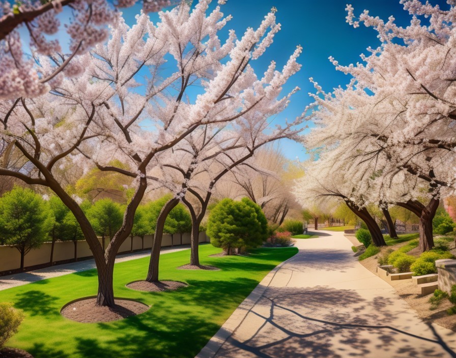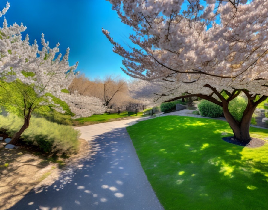 A serene path lined with blooming white cherry blossom trees and vibrant green grass under a clear blue sky.