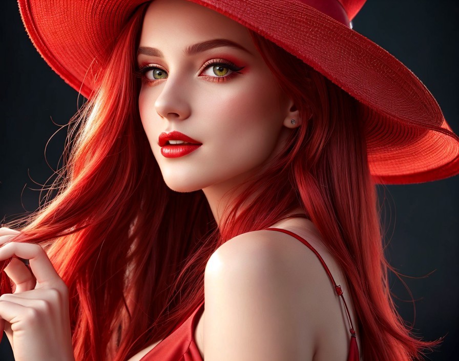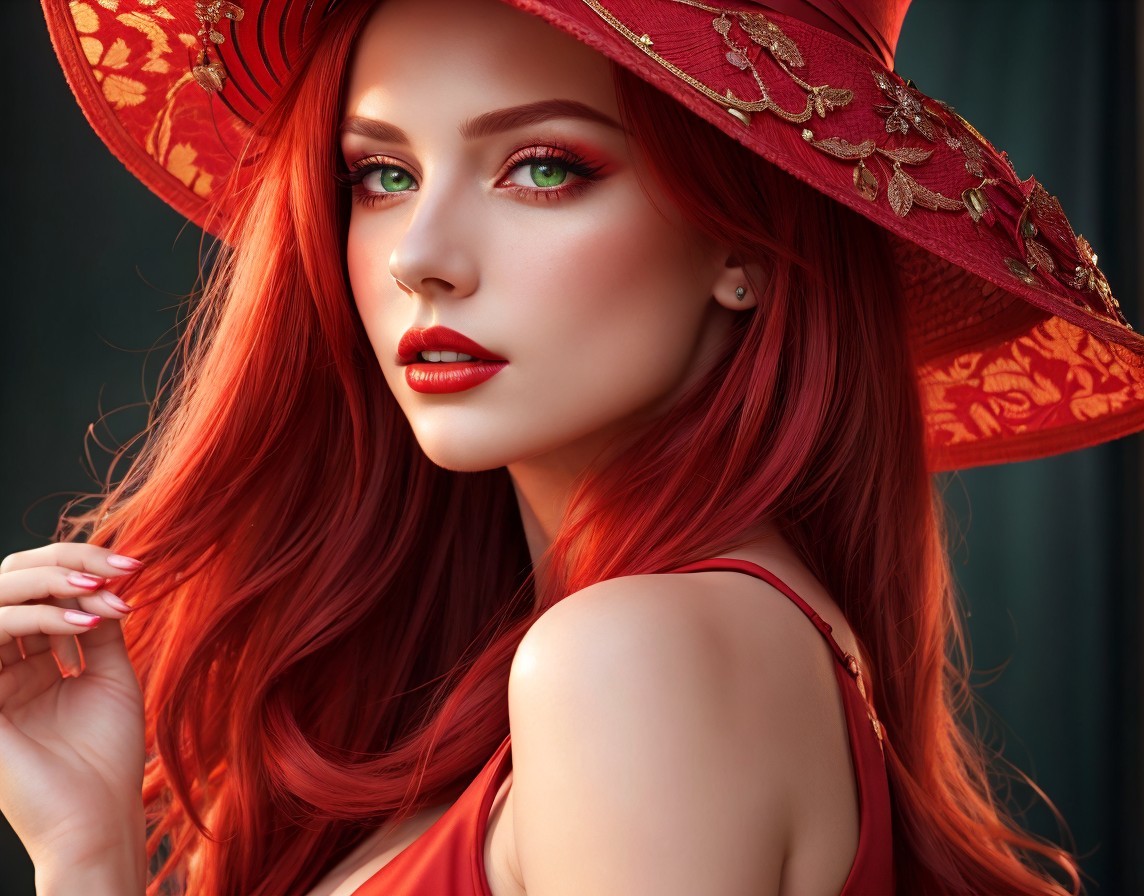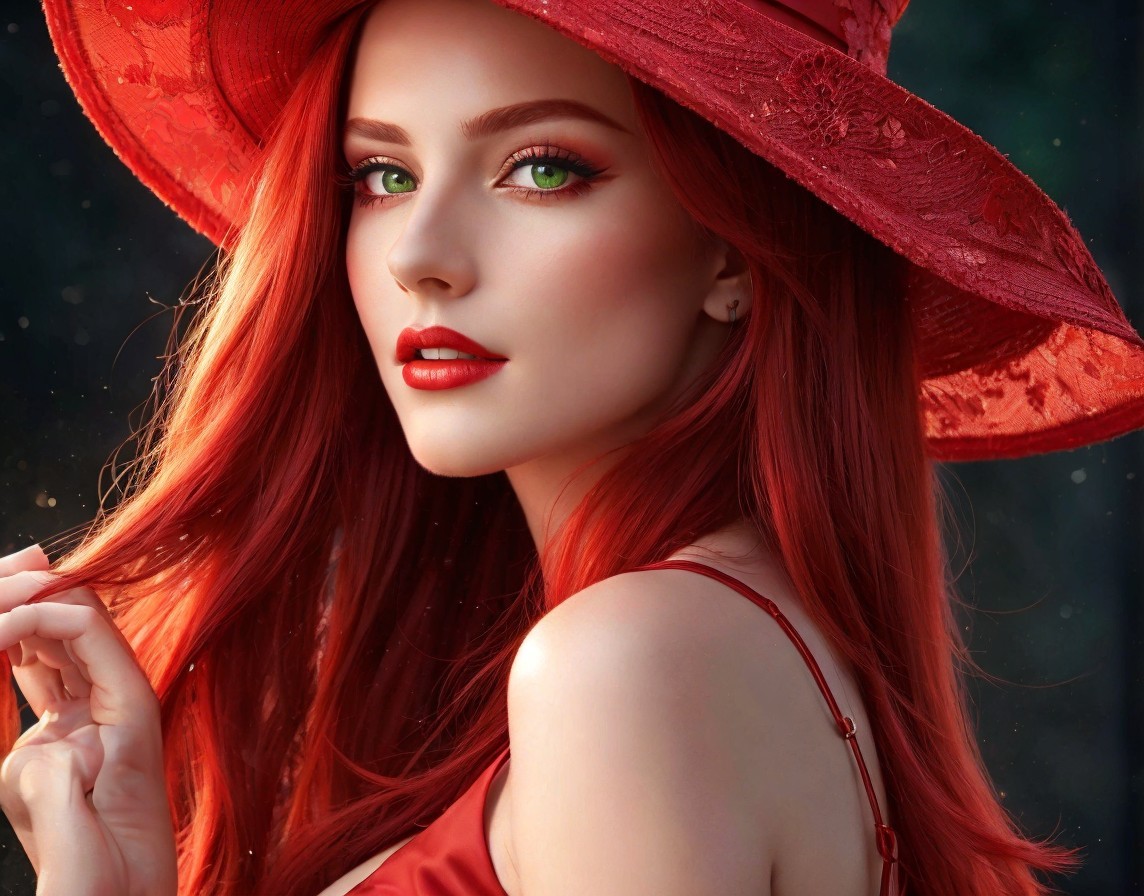 A woman with red hair and lipstick wearing a wide-brimmed hat looks at the camera with striking green eyes.