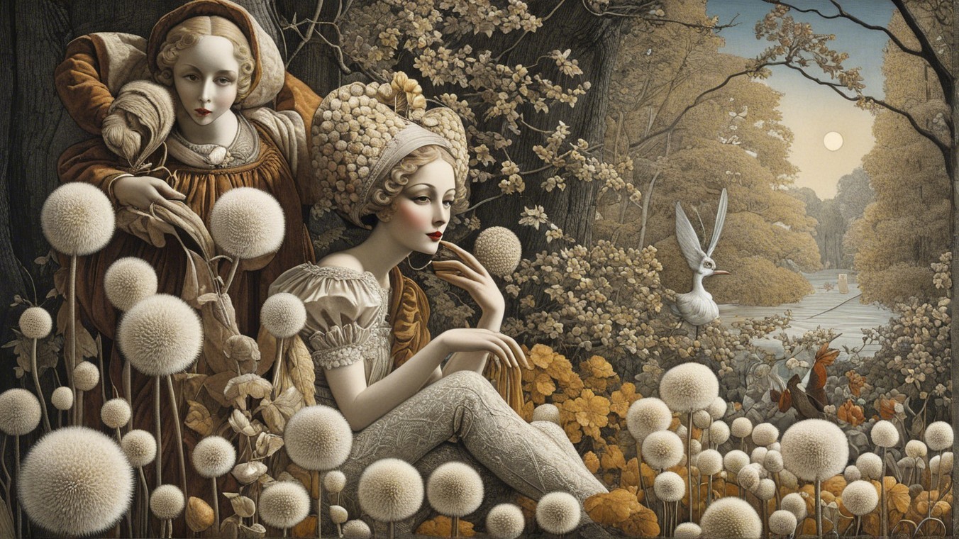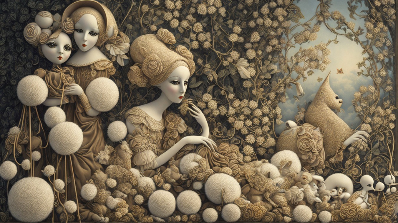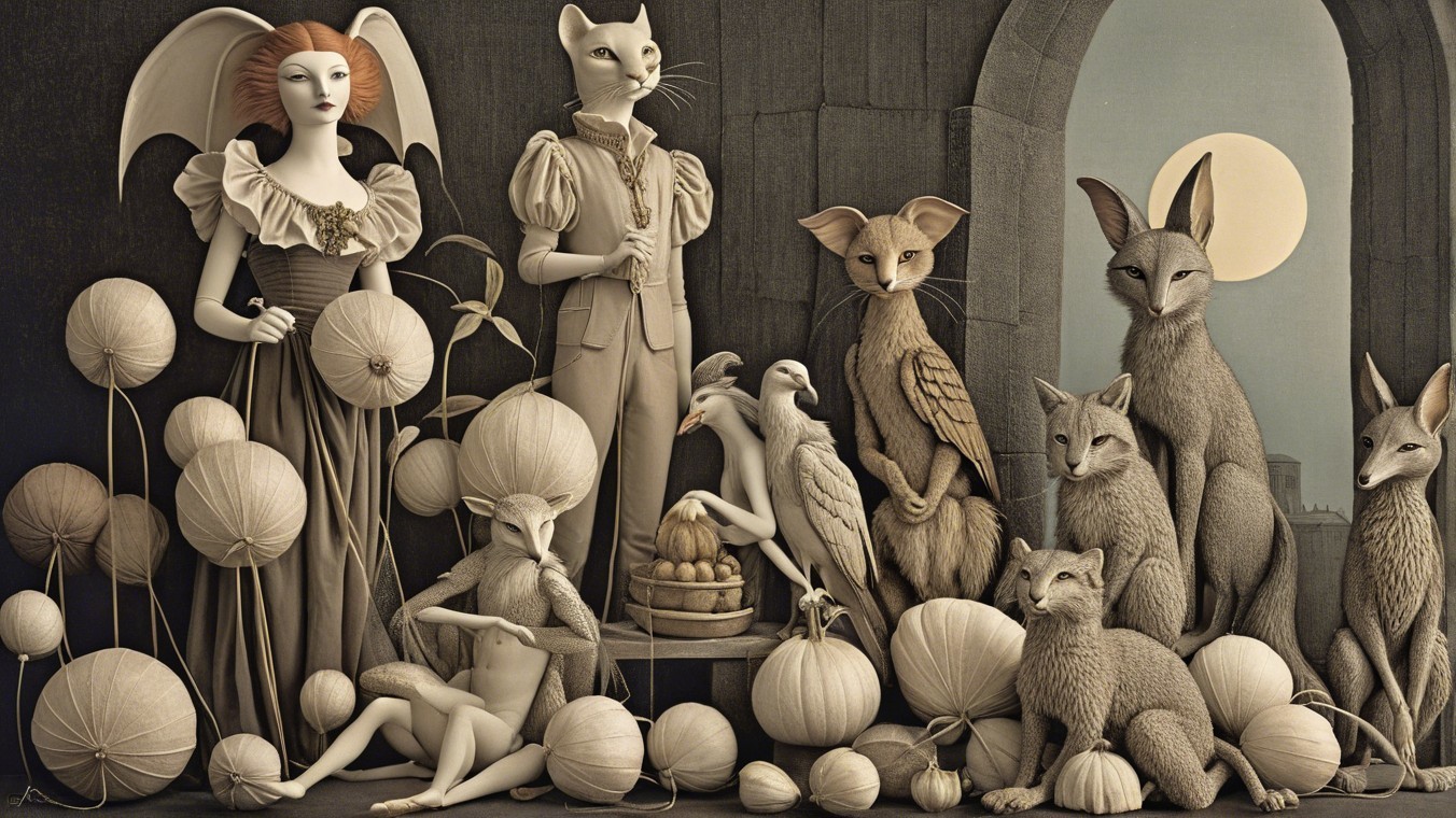 This artistic image features four anthropomorphic figures: two elegant cat-like characters in vintage attire, a stylized human figure, and a sleek, modern cat. They pose together against a neutral background.