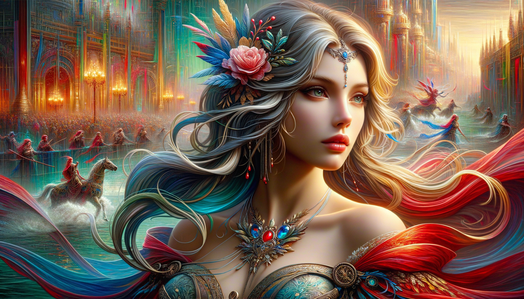 A fantasy warrior queen with flowing hair and ornate armor stands before a battle, exuding a blend of beauty and strength.