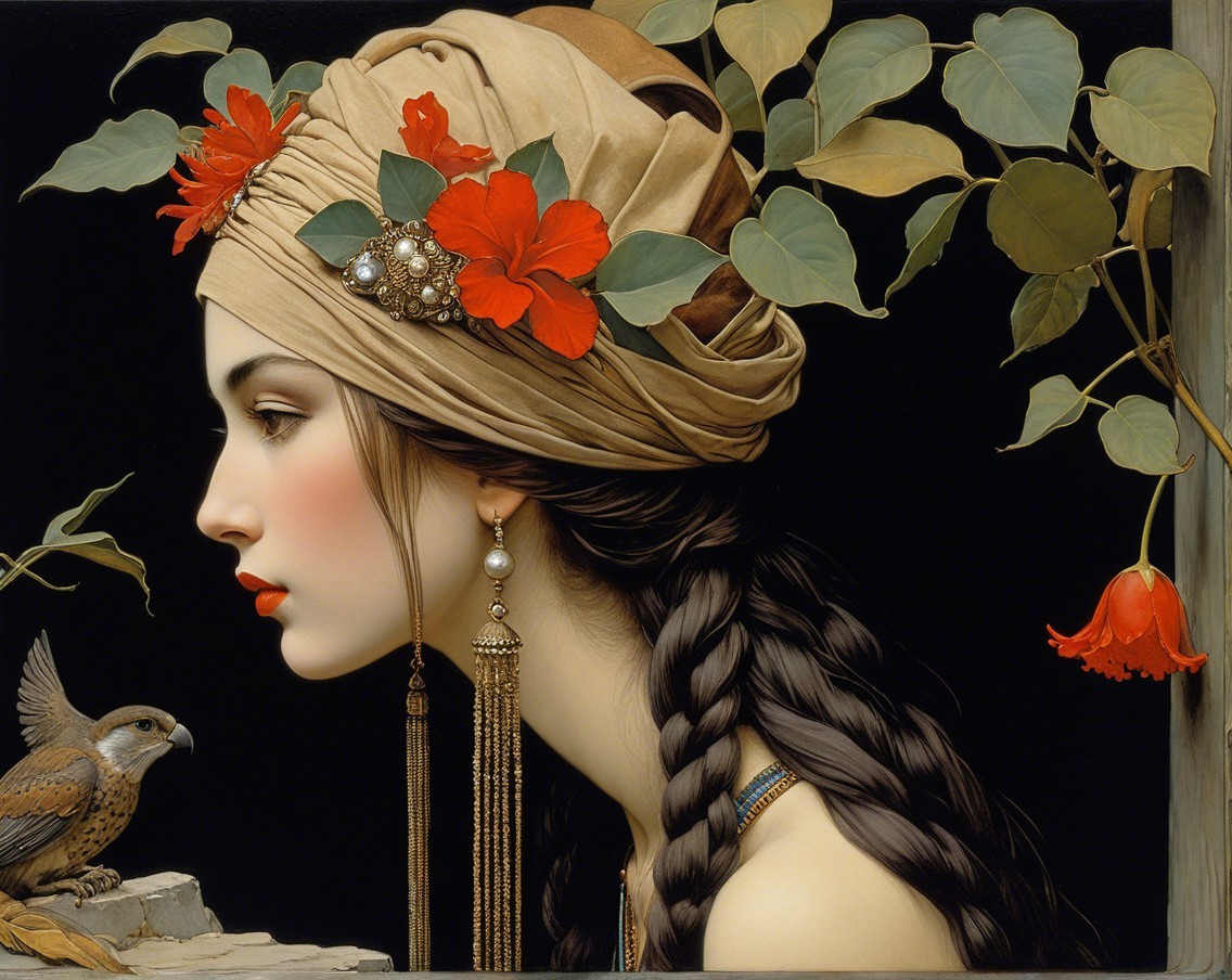 A striking scene under a full moon, featuring a glamorous woman in a dark gown lounging on rocks, while a somber man kneels nearby, gazing at her with longing against a serene ocean backdrop.