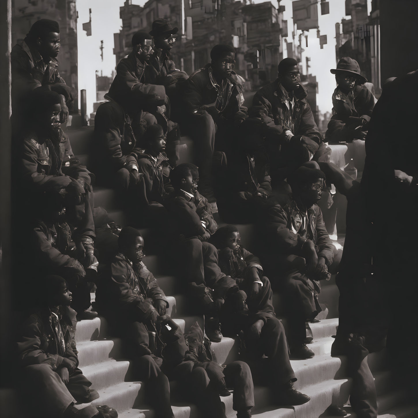 South Central Los Angeles, 1970's, Old dilapidated rundown tenements, Gray-brown brick buildings, Large front stoop, people sitting on the stoop, Old street lamps