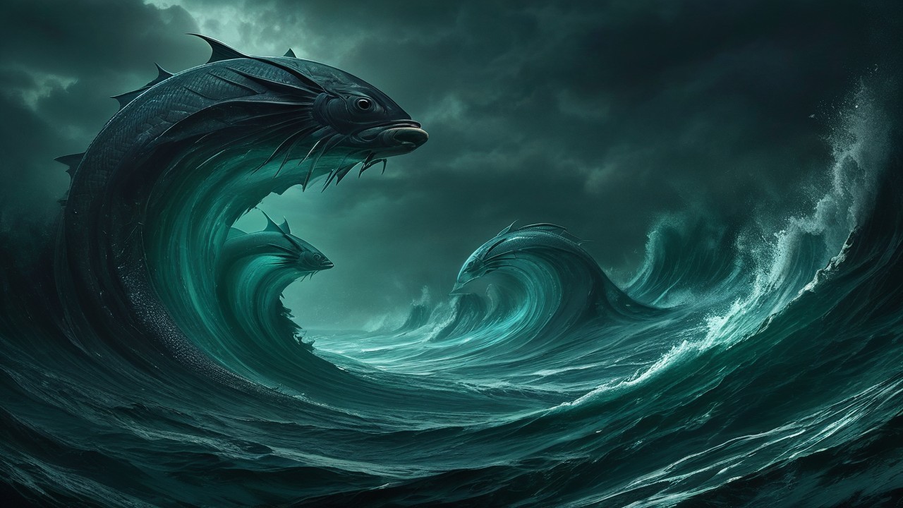 Prompt: "The writhing deep, a whirlpool of fish fighting frenzy.