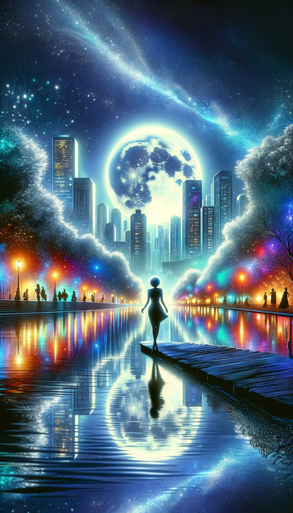 A figure stands on a pier, overlooking a futuristic city under a luminous celestial sky with vibrant colors reflected in the water.