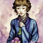 The image features a stylized, ethereal figure with flowing hair, dressed in a green garment adorned with intricate patterns. The background has a purple-yellow hue, enhancing the atmosphere by Hayato's speech :