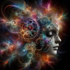 A vibrant, fantasy-inspired portrait of a woman with colorful, swirling hair and elaborate makeup, featuring shimmering details and sparkling accents that evoke a magical, otherworldly feel.