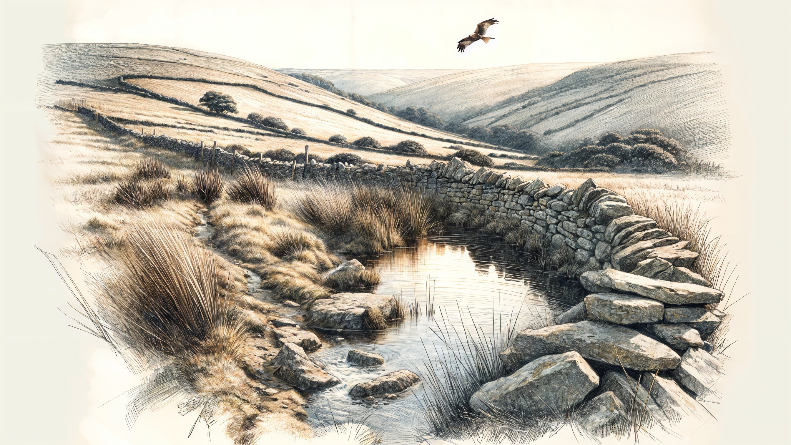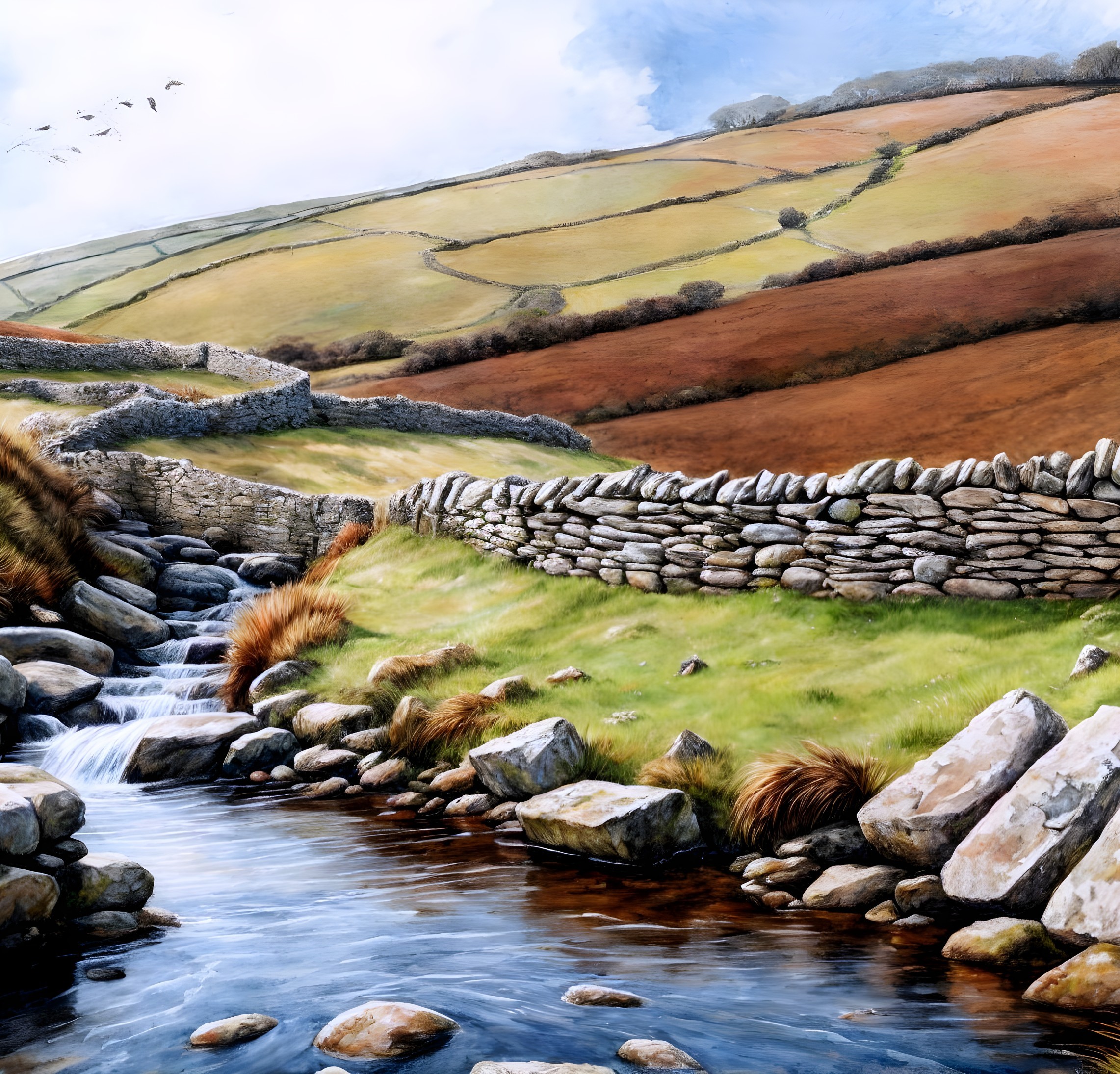A majestic bird soars over a tranquil stream winding through golden grasses, framed by rolling hills under a soft, cloudy sky. Nature's serene beauty captures a moment of peaceful freedom.
