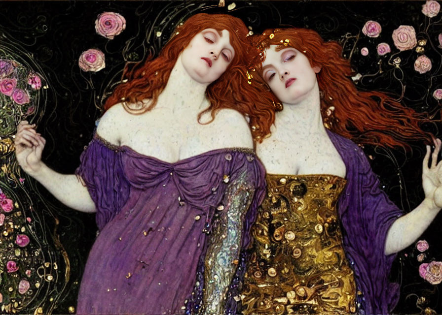 Prompt: Beautiful pre-Raphaelite demon and angel, dancing in a gowns made of shattered glass, surrounded by roses. Distressed, spattered paint, dripping paint, molten gold, embossed gold, scratches. Intense action, spinning. Splinters of glass. Shards of glass.