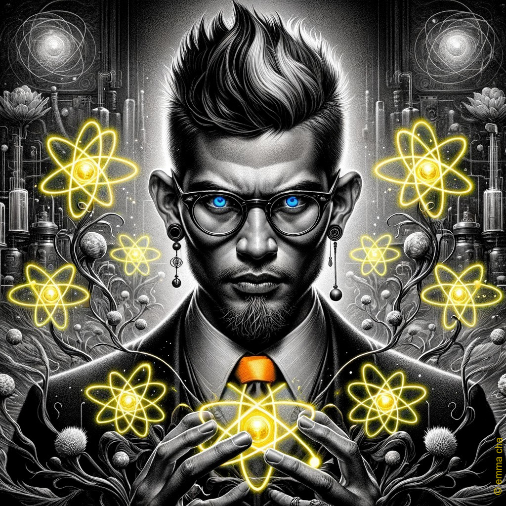 A stylized image of a man with glasses surrounded by atomic symbols and futuristic machinery, in a monochrome palette with yellow accents.