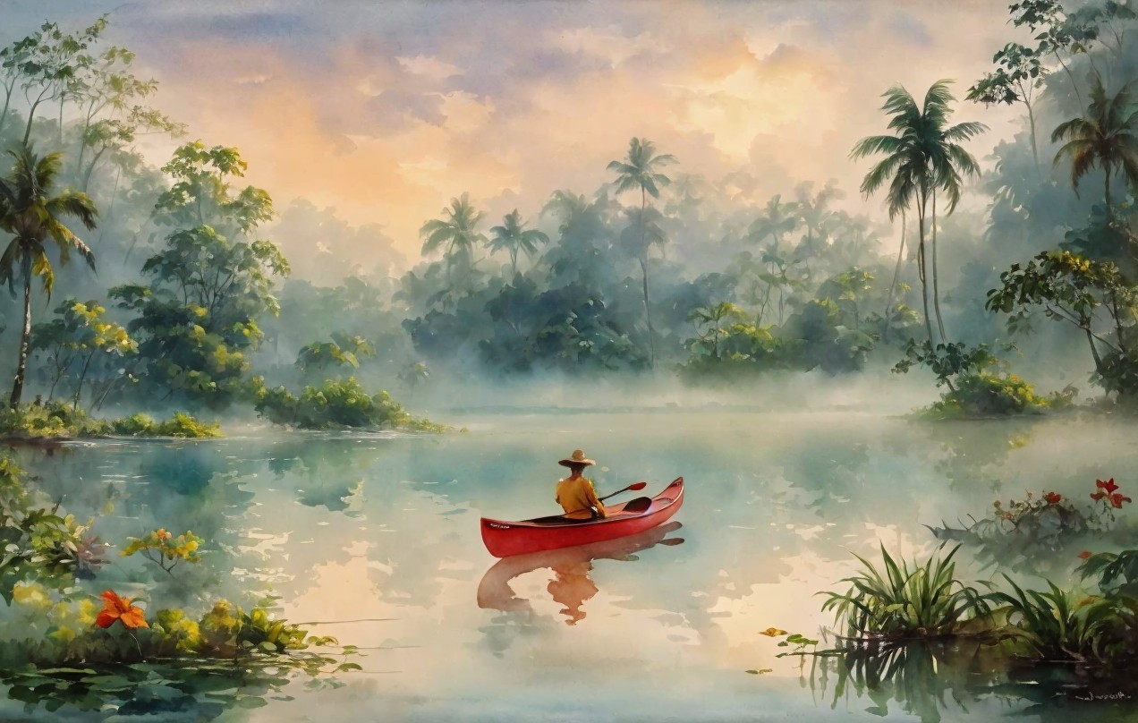 A serene watercolor scene depicts a lone figure in a red canoe, gliding through a misty lake surrounded by lush greenery and palm trees, as soft hues of dawn illuminate the sky.