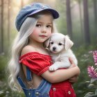 A young girl with long, light blonde hair wears a cap and a red off-shoulder top, holding a small white puppy. They stand in a colorful, dreamy forest filled with flowers and soft light.