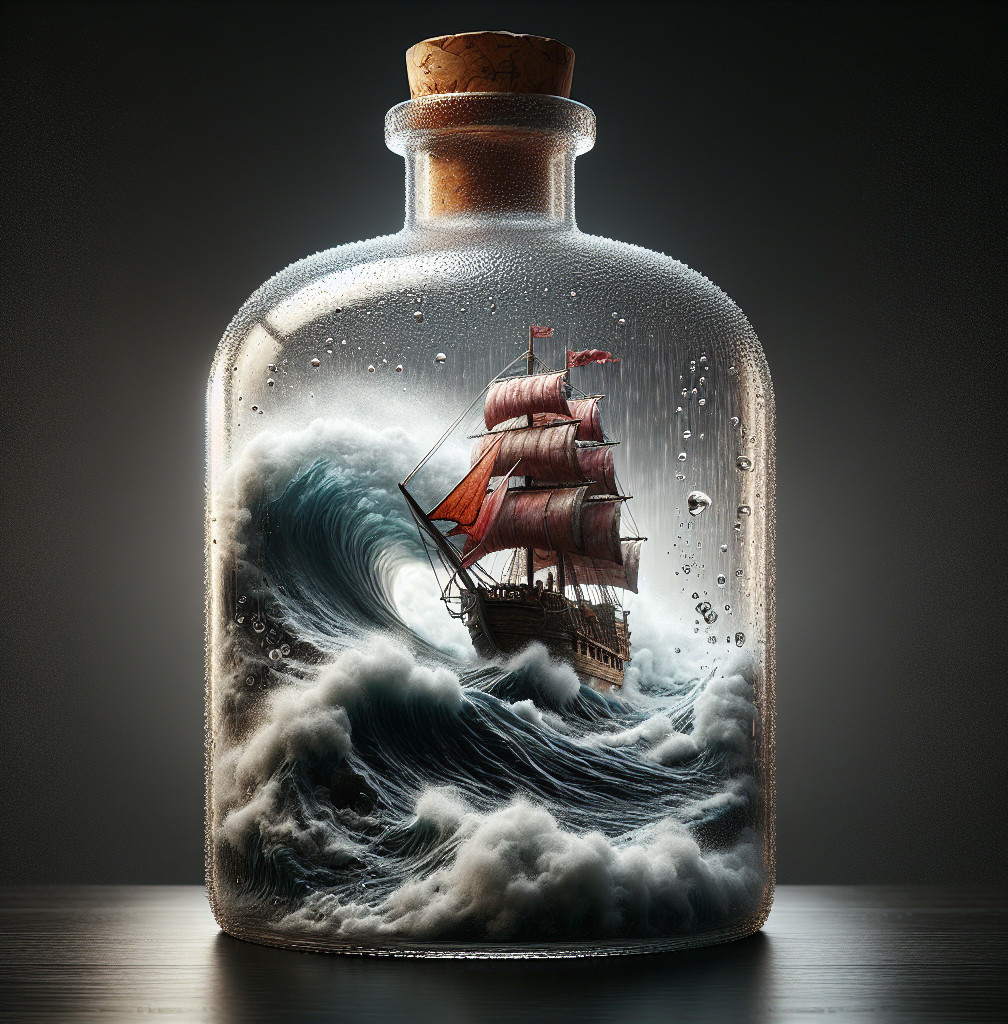 A detailed ship in a bottle captures a fierce storm, with crashing waves and vibrant sails. The glass gleams, highlighting the tumultuous ocean scene inside, evoking adventure and nostalgia.
