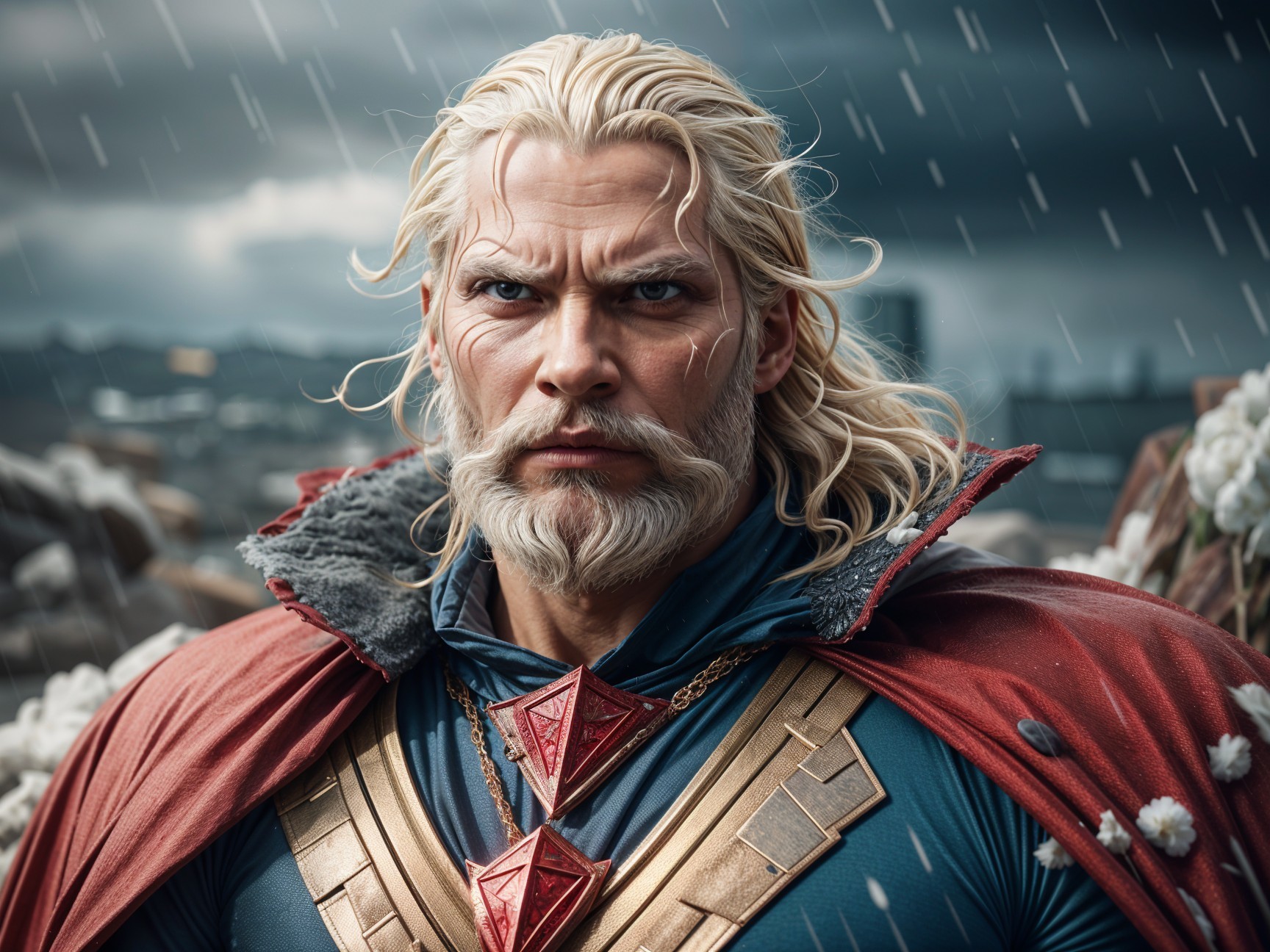 A muscular superhero with long blonde hair and a dramatic expression, wearing a colorful costume with a red cape and gold accents. The background features a moody, urban setting.