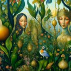 The artwork features two ethereal, serene female figures surrounded by lush, vibrant foliage and flowers. Intricate details reveal a harmonious blend of nature and beauty, emanating tranquility.