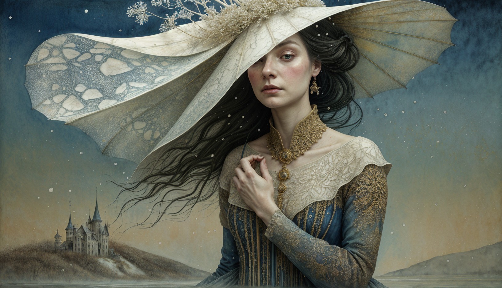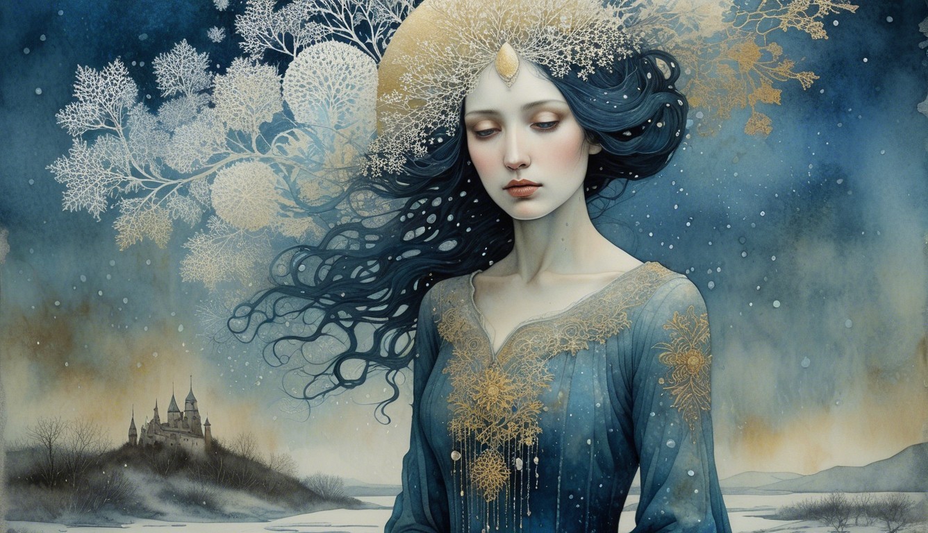 A serene figure in a flowing blue gown stands against a winter landscape. Delicate, lace-like patterns surround her, evoking the beauty of nature in a dreamy, ethereal atmosphere.