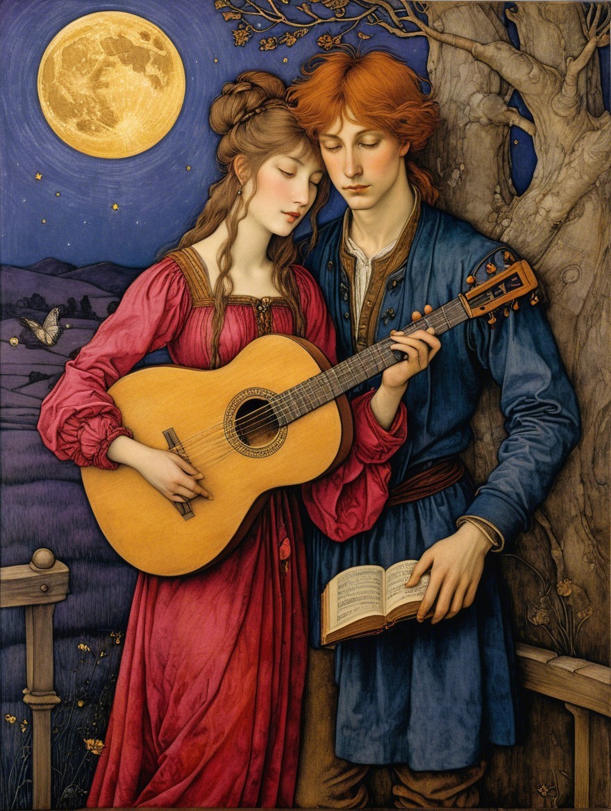 A tender scene under a full moon, featuring a couple dressed in vintage attire. The woman in a pink dress plays a guitar while the man holds sheet music, capturing a moment of romance and melody.