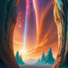 A serene figure in a flowing red dress gazes out from a mystical oval frame, revealing a starry sky, a glowing moon, and towering mountains bathed in twilight hues, evoking a magical atmosphere.