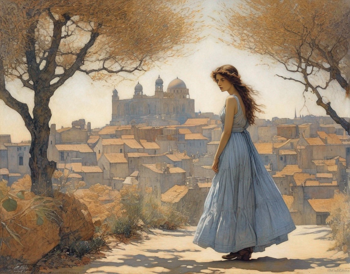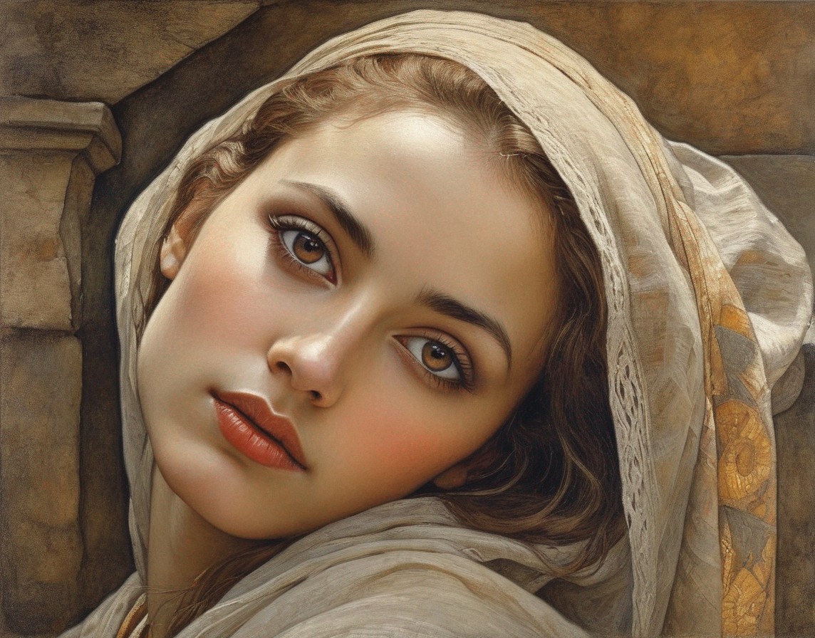 A woman with striking hazel eyes and a cream headscarf gives an intense gaze. She embodies a timeless beauty with finely detailed features.