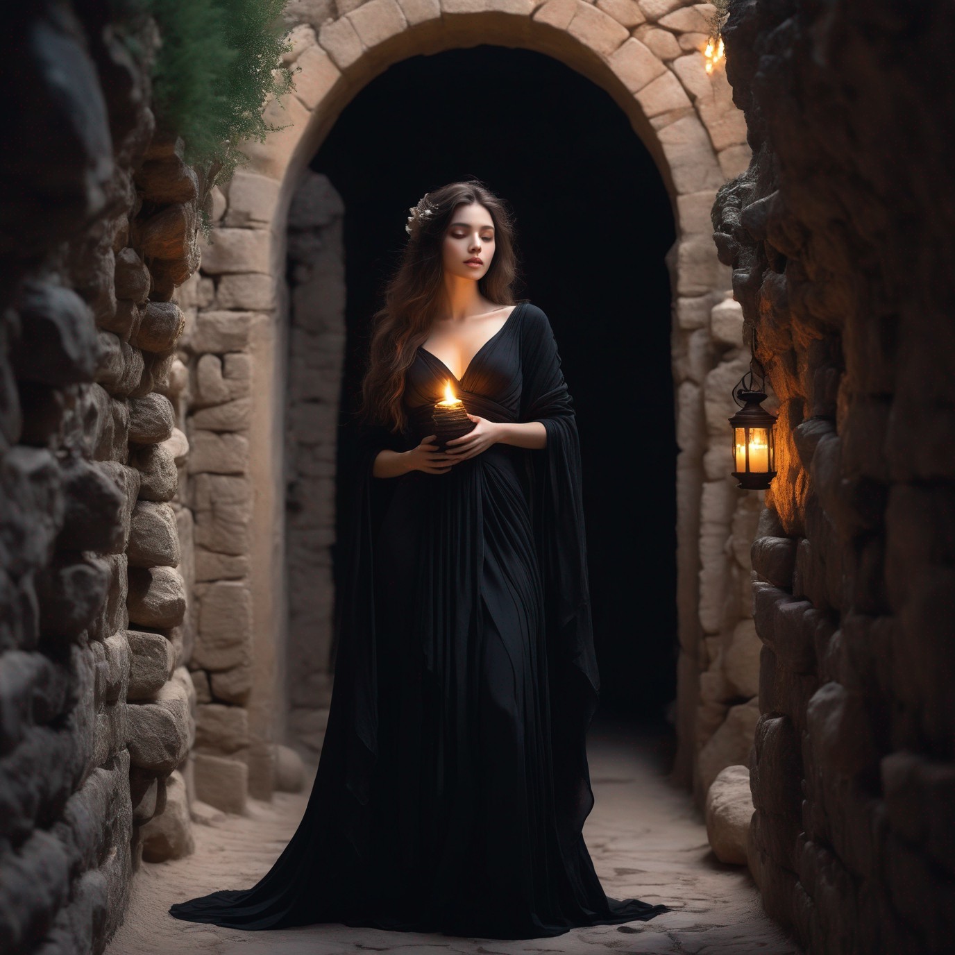 A woman in a flowing black dress stands in a stone corridor, holding a candle, with flowers in her hair and lanterns glowing softly.