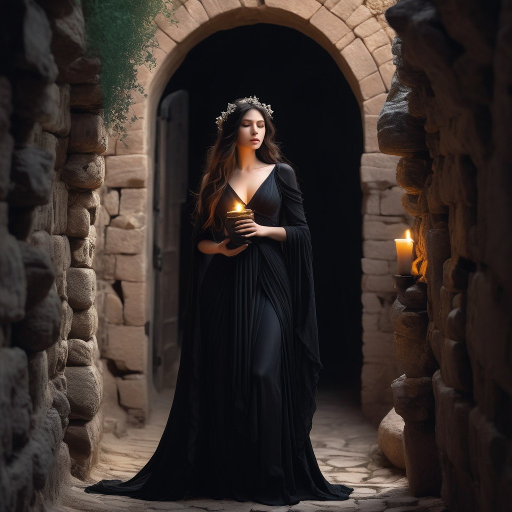 Enigmatic woman draped in somber black attire, reminiscent of a grieving widow, wandering through labyrinthine ancient corridors, cradling a fragile bloom, melodiously singing. Surroundings adorned with flickering torchlight, illuminating weathered stone walls hewn from valley rocks, resonating with whispers of bygone eras. Character, Kyre Sora, the Siren Lady, embodies sophistication with a pallid complexion, gleaming golden eyes, and cascading locks. Ambiance exudes a blend of grand fantasy tinged with sorrow, highlighting beauty and poise. Elaborate embellishments in garments and environment, teeming with emotional intricacies, crafting a tableau of haunting allure and wistfulness. Envision a dark hood and cloak shrouding her form. Executed in a fantasy painting style, whether through digital artistry or intricate pencil sketches.