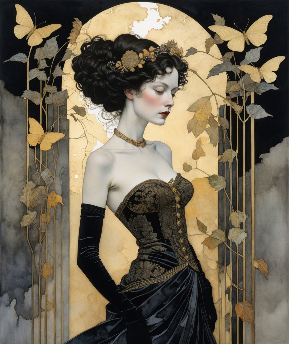 A graceful woman in an elegant black gown stands against a golden moon backdrop, surrounded by delicate butterflies and leaves, exuding a mystical, ethereal beauty.