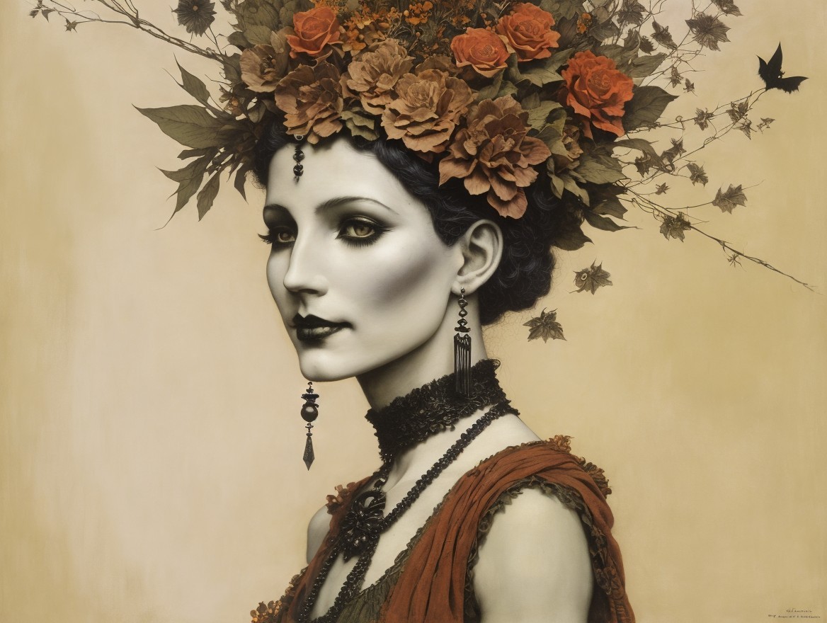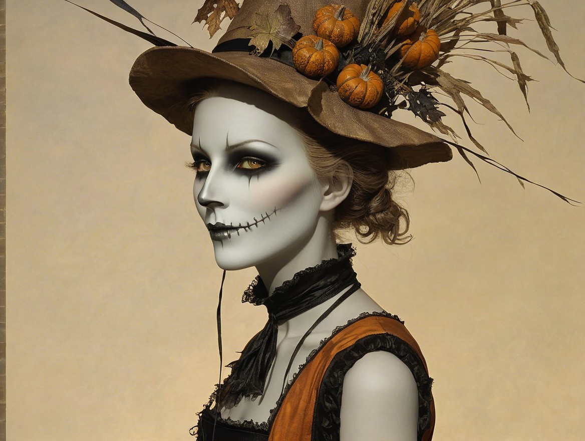 A striking figure with a skull-like face and piercing eyes, dressed in a vintage dark outfit. A tall hat adorned with pumpkins and wheat adds a seasonal touch to the eerie, artistic portrait.