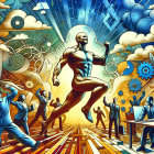 A dynamic urban scene features a muscular man sprinting through a vibrant city street, surrounded by animated rodents and lively people, blending action and humor in a colorful environment.