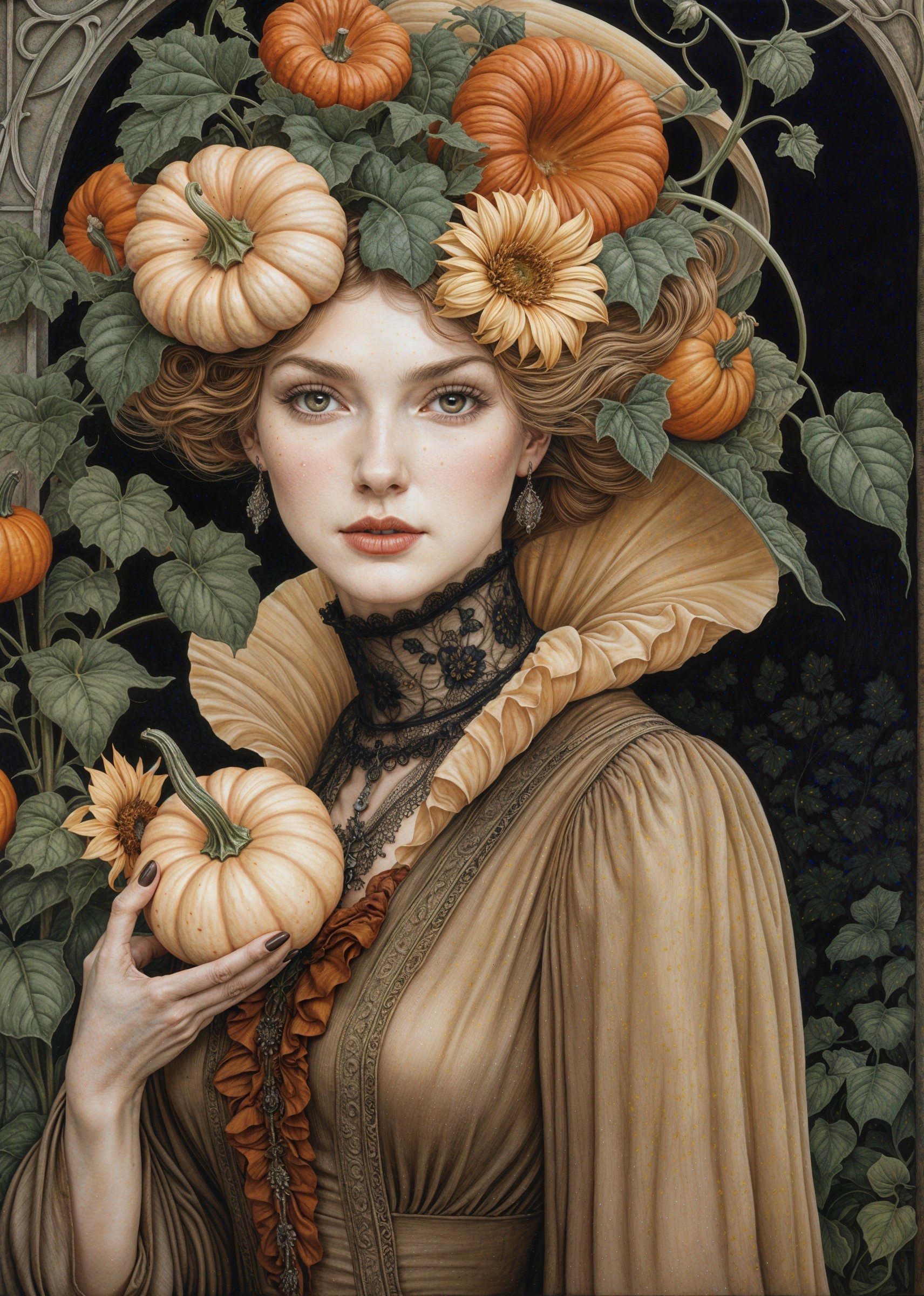 A woman with voluminous, curly blonde hair and a stylish hat adorned with pumpkins stands amidst lush foliage, elegantly holding a small pumpkin, exuding autumn charm and grace.