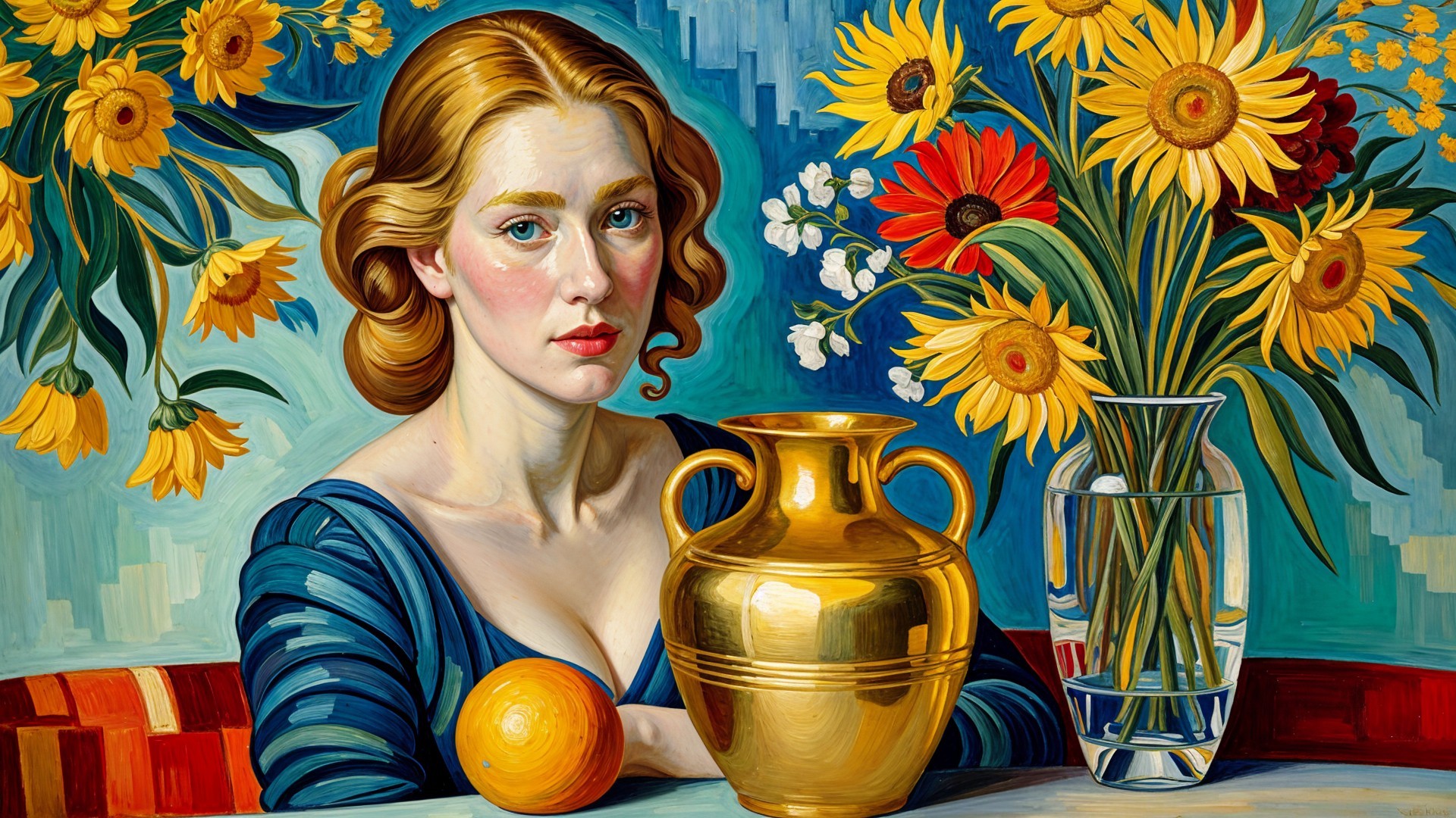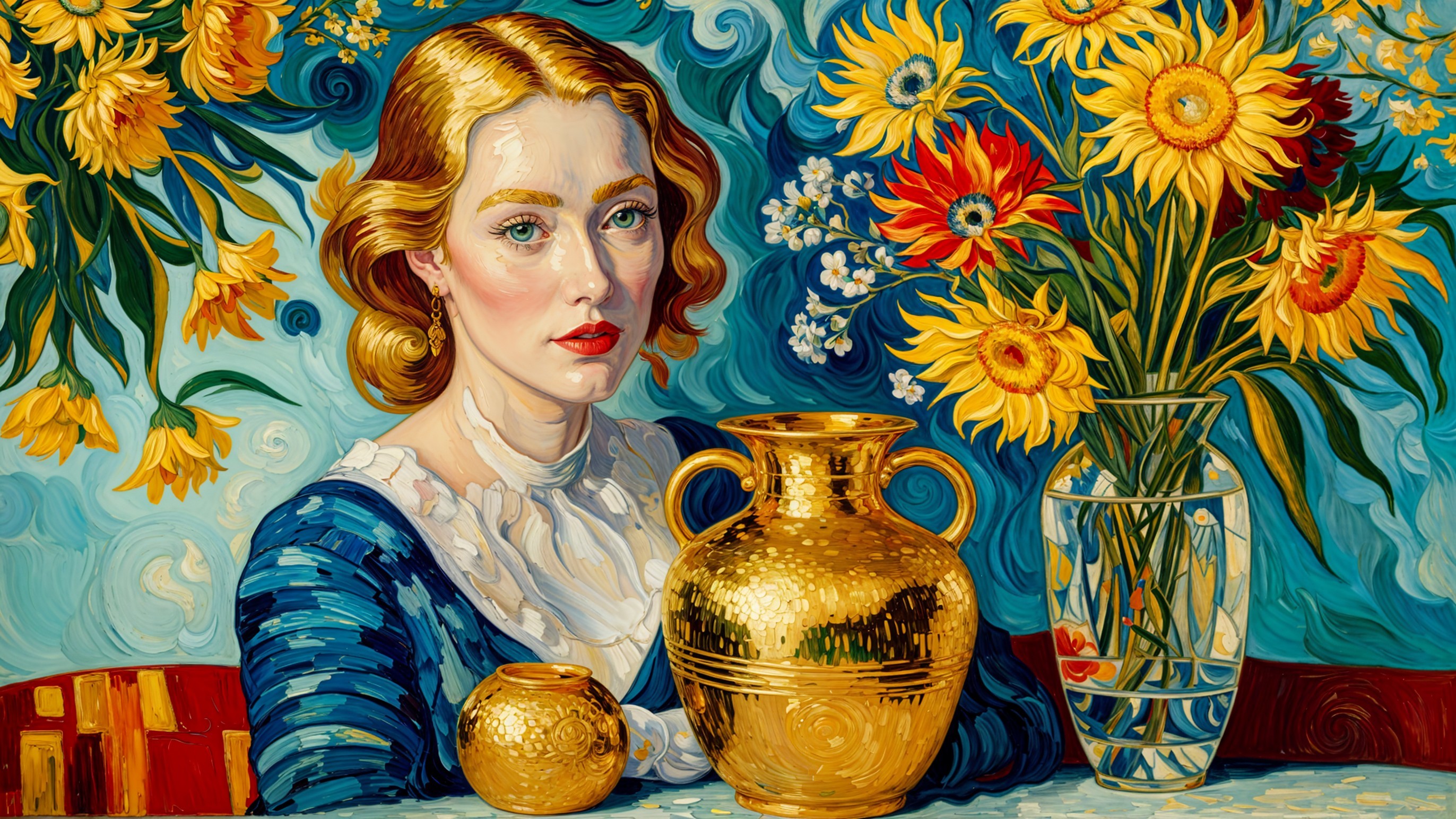 A vibrant painting features a young woman with golden hair, dressed in blue, surrounded by colorful flowers in a vase and a bowl, set against a swirling floral backdrop.